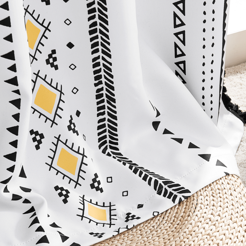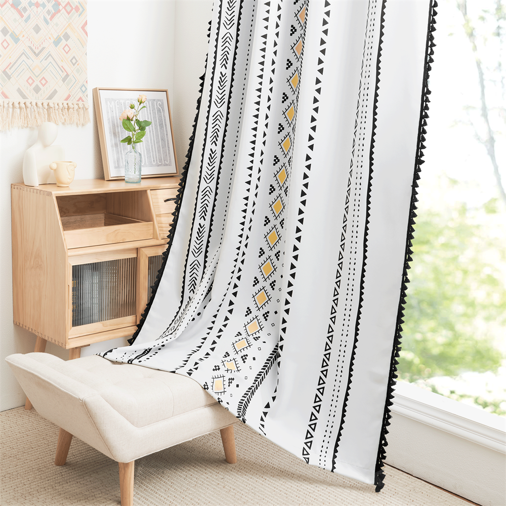 Vores etnisk boho gardin med kvaster er designet til at passe ind i mange forskellige stilarter, fra den minimalistiske nordiske indretning, der trænger til et pift, til den fuldendte boheme-oase. De sorte og hvide etniske mønstre, kombineret med de varme gyldne accenter, skaber en harmonisk balance, der både er beroligende og visuelt interessant. Uanset om du hænger det i stuen, soveværelset eller et hyggeligt læsehjørne, vil dette gardin give rummet et personligt og indbydende præg. Det er mere end bare et vinduesbeklædning; det er en måde at udtrykke din egen unikke stil og skabe et hjem, der føles ægte og levende.