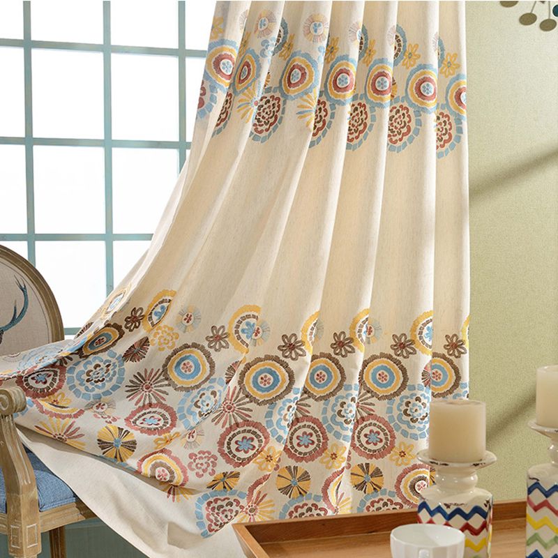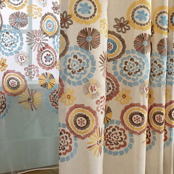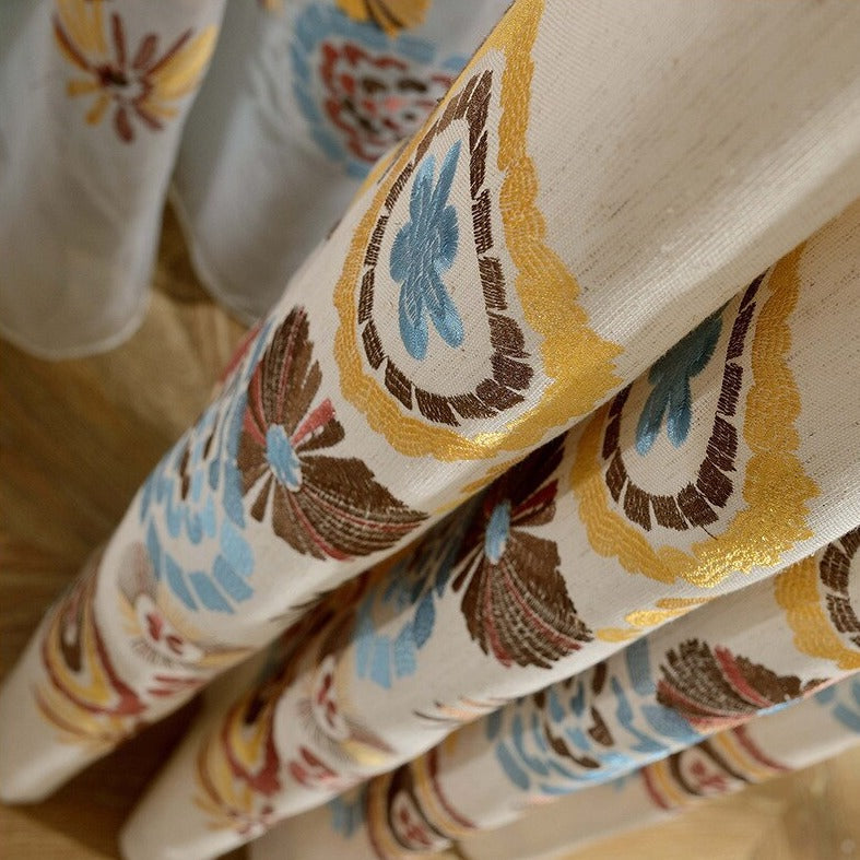 Dette gardin er ikke blot et praktisk element, men et kunstværk i sig selv. Den creme-farvede baggrund giver en lys og luftig følelse, mens den smukke boheme-inspirerede kant, der pryder bunden og midten, tilføjer en dybde af farver og mønstre. De håndbroderede detaljer i nuancer af varm gul, dyb rød, beroligende blå og jordbrun skaber et organisk og levende udtryk, der passer perfekt ind i et hyggeligt og afslappet hjem. Forestil dig, hvordan dette gardin vil give dit soveværelse en drømmende stemning eller tilføje et eksotisk præg til din stue. Det er et gardin, der inviterer til ro og refleksion, mens det stadig fejrer livets farverige mangfoldighed.