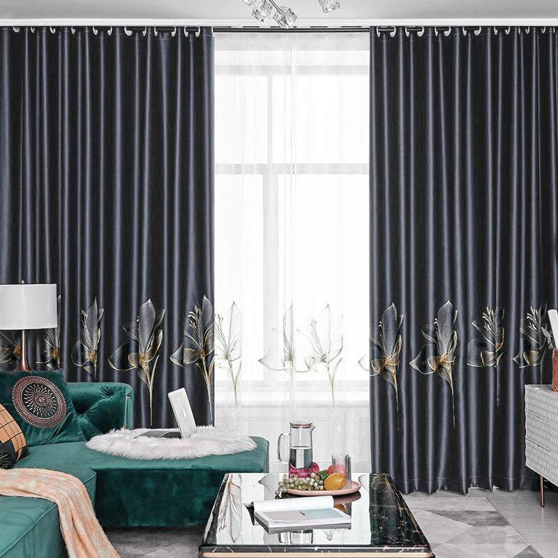 Gråt mørklægningsgardin med gyldent blomstermotiv: Skab den perfekte stemning