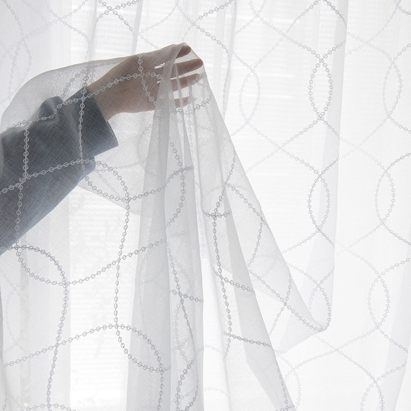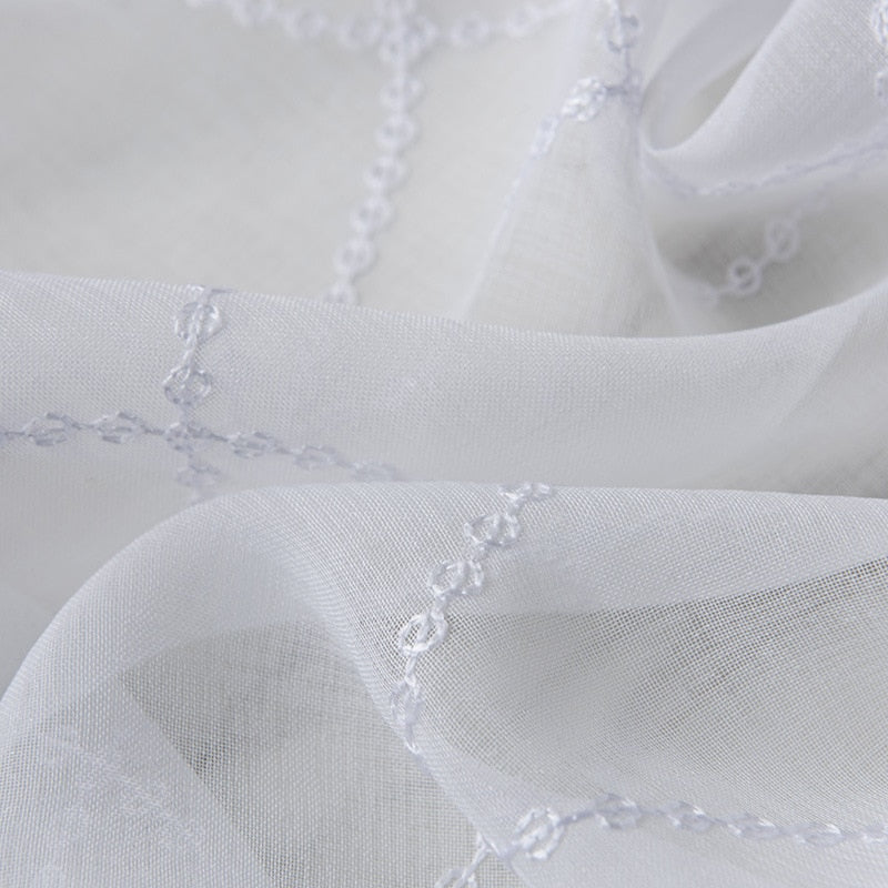 Vores hvide voile gardin er fremstillet med fokus på både æstetik og funktionalitet. Det geometriske mønster er vævet ind i stoffet, hvilket sikrer en holdbar og flot finish, der ikke falmer over tid. Voilestoffet er kendt for sin lethed og transparens, som lader dagslyset strømme ind, mens det stadig beskytter mod nysgerrige blikke udefra. Det er den ideelle løsning for dig, der ønsker at opretholde en lys og åben følelse i rummet, samtidig med at du opnår en vis grad af privatliv. Gardinets design gør det nemt at integrere i forskellige indretningsstile, fra det minimalistiske til det mere traditionelle, og det vil helt sikkert løfte udseendet i dit hjem.