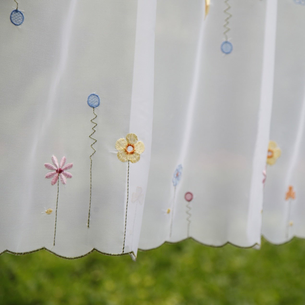 Vores korte lette gardin med broderi er mere end bare et vinduesbeklædning. Det er en fortælling om farver, teksturer og håndværk, der bringer liv og personlighed ind i dit hjem. Hvert broderet blomstermotiv er nøje udvalgt for at skabe et livligt og muntert mønster, der vil glæde øjet hver dag. Forestil dig den glæde, det vil være at vågne op til disse smukke gardiner, der indrammer din udsigt til verden udenfor. De er nemme at hænge op og passer perfekt til alle vinduer, hvor du ønsker et let og luftigt udtryk. Gardinet er utrolig alsidigt og kan nemt kombineres med andre tekstiler og indretningsstile for at skabe dit helt eget, unikke udtryk. Giv dit hjem den fornyelse, det fortjener, med et gardin, der både er funktionelt og smukt.