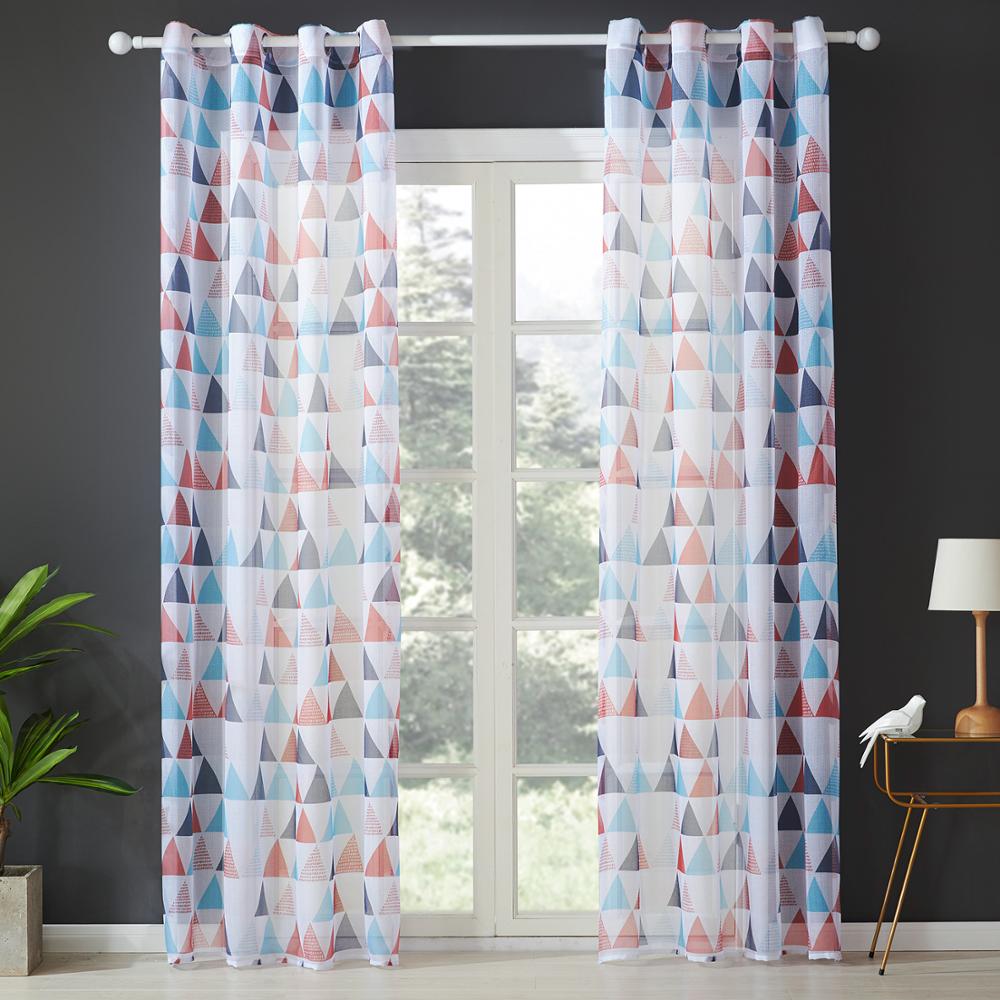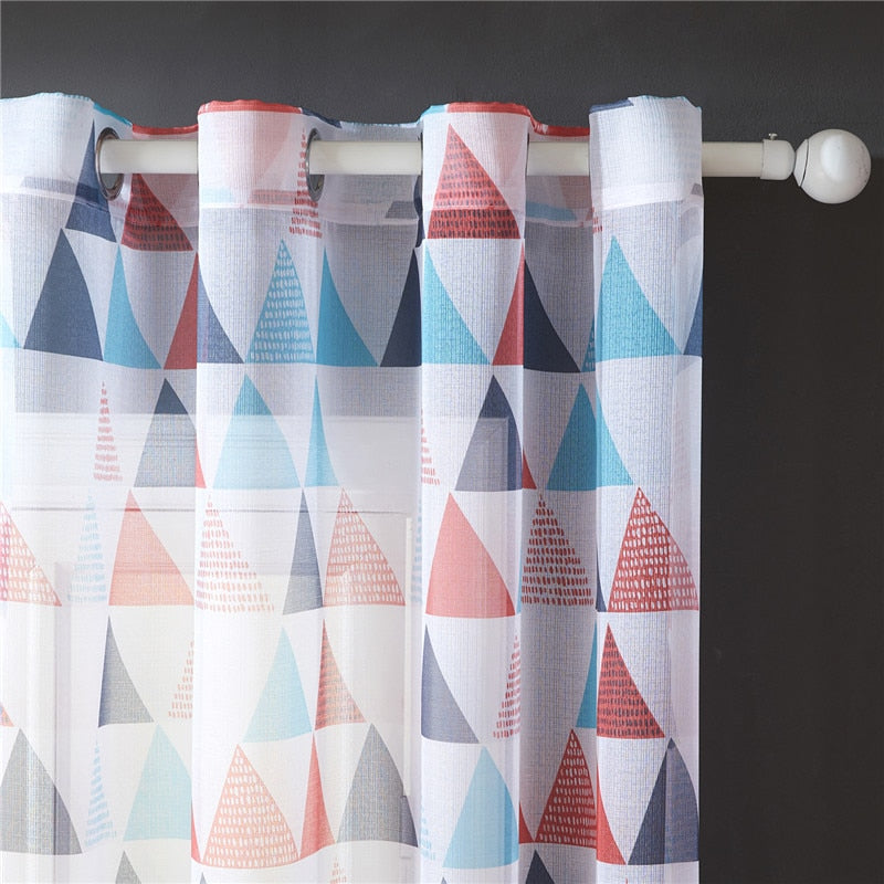 Dette gardin er designet til at give dit rum et friskt og moderne udtryk. De legende trekanter i nuancer af rød, blå og lyseblå skaber et mønster, der er både indbydende og visuelt interessant. Stoffets lette tekstur lader lige nok lys trænge igennem til at oplyse rummet blidt, mens det stadig tilbyder et smukt farvespil. Det er ideelt til stuen, soveværelset eller børneværelset, hvor det kan fungere som et diskret, men alligevel iøjnefaldende element i din indretning. Forestil dig de bløde skygger, mønsteret kaster, når solen skinner igennem – en sand fryd for øjet.