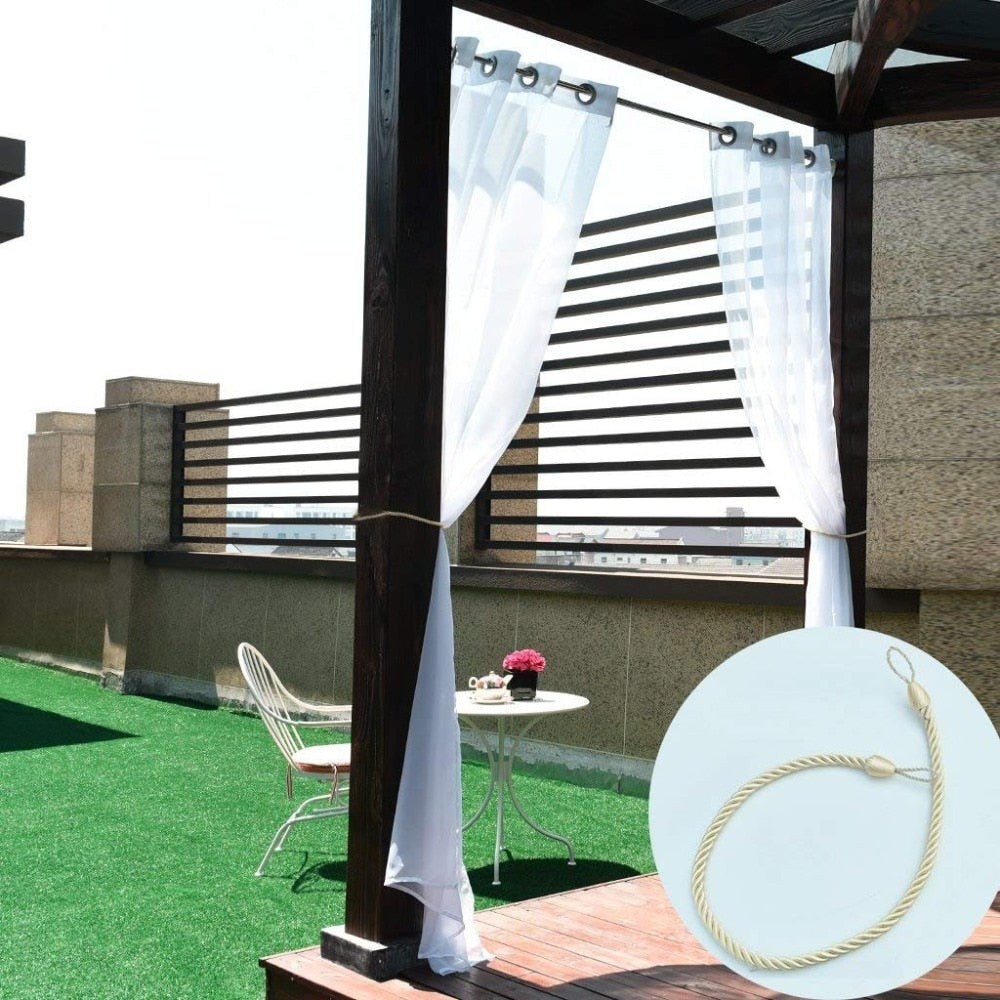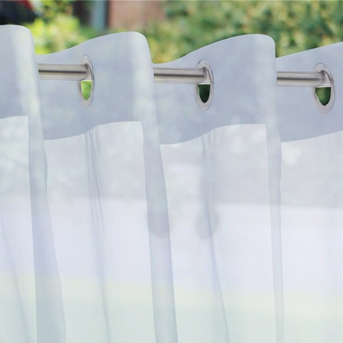 Vores lette og transparente udendørs gardin er ikke kun praktisk, men også et æstetisk løft for enhver udendørs indretning. Den rene hvide farve passer ind i næsten enhver farvepalet og tilføjer et friskt, luftigt præg. Gardinet er fremstillet af et slidstærkt og vejrbestandigt materiale, der er designet til at modstå elementerne, så du kan nyde dets skønhed sæson efter sæson. De indbyggede metalringe (5 cm i diameter) gør ophængningen utrolig nem og sikrer, at gardinet glider jævnt på din gardinstang. Forestil dig de lange sommeraftener, hvor dette gardin fanger den sidste solstråle og skaber en magisk glød i dit udendørs rum.