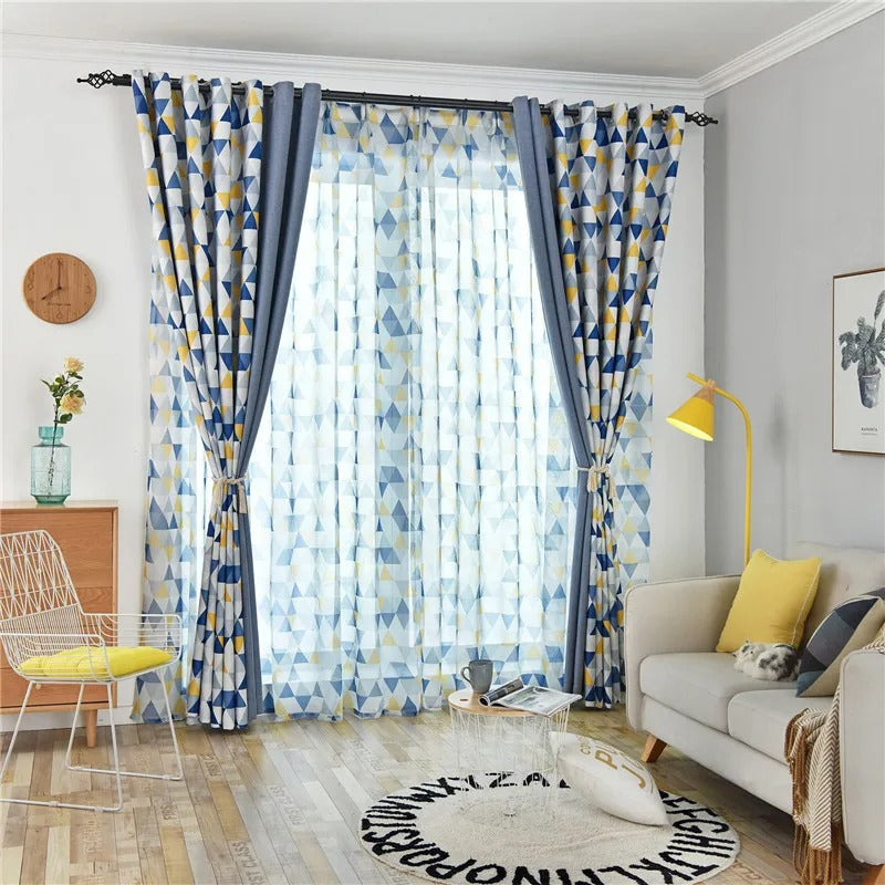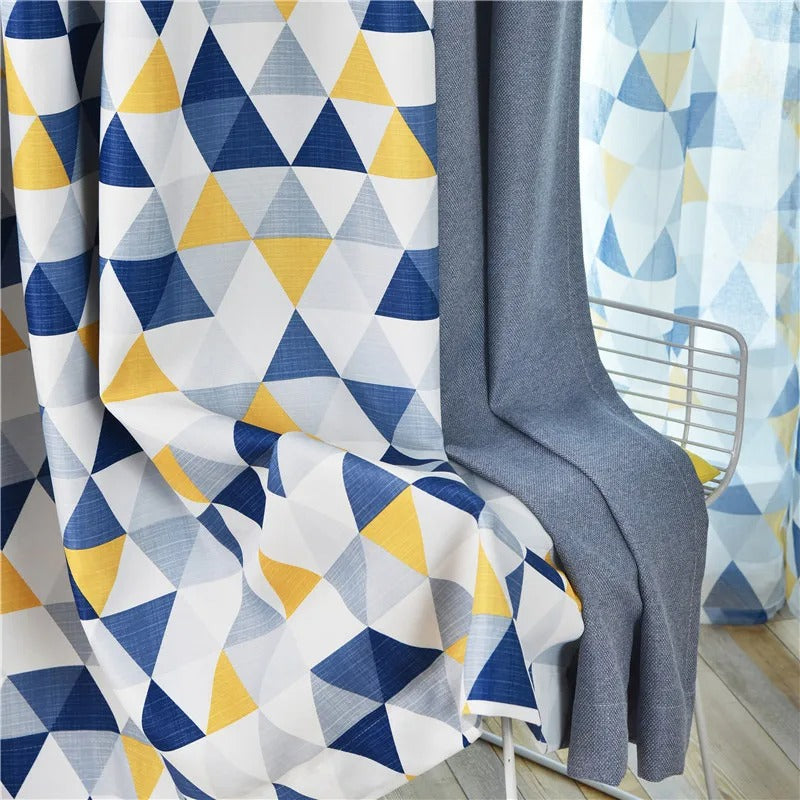 Forvandl dit hjem med vores smukke mørklægningsgardiner, der kombinerer funktionalitet med et moderne design. Dette mørklægningsgardin med blåt geometrisk mønster er ikke bare praktisk til at blokere lyset ude; det er også en elegant tilføjelse til enhver indretning. Det livlige mønster af blå, gule og hvide trekanter bringer et frisk pust ind i rummet og skaber en indbydende atmosfære. Forestil dig at vågne op udhvilet i et rum, hvor solens skarpe stråler holdes ude, samtidig med at du nyder et stilrent design, der matcher din personlige stil. Perfekt til soveværelset, stuen eller ethvert rum, der har brug for både stil og effektiv lysregulering.