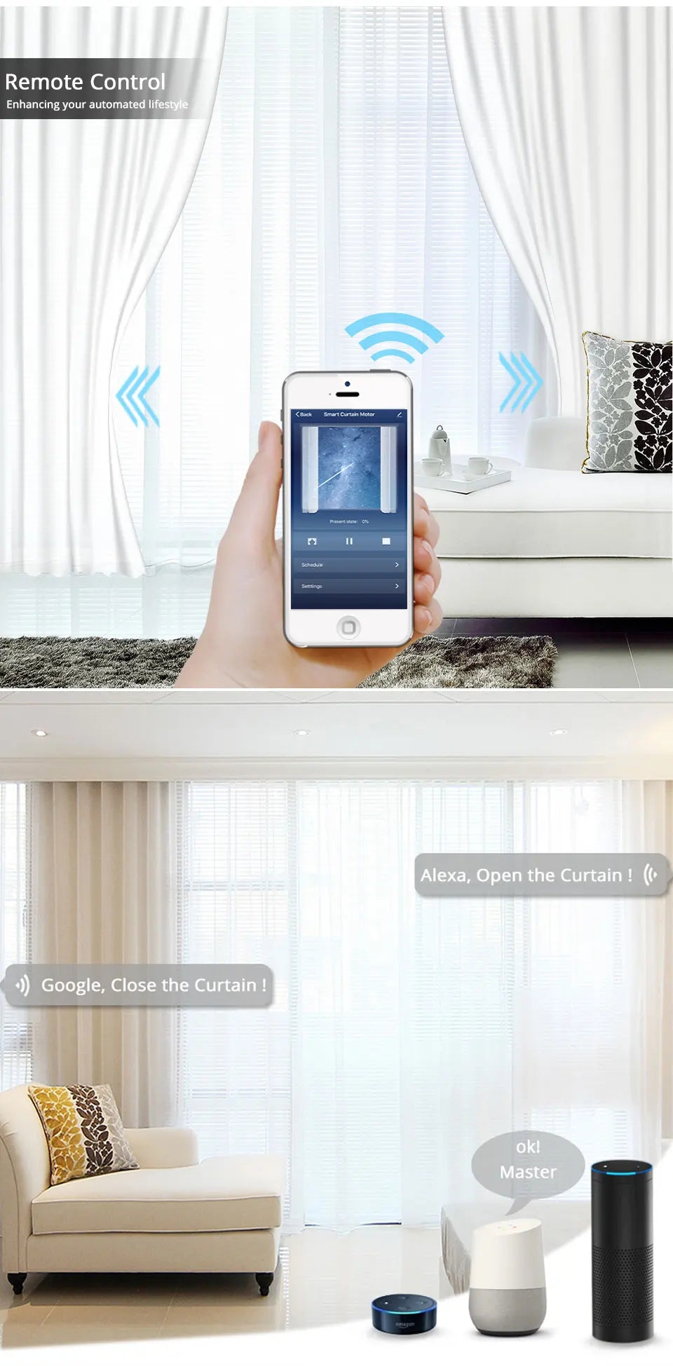 - Stemmestyring med Amazon Alexa og Google Assistant: Åbn eller luk gardinerne med simple stemmekommandoer.