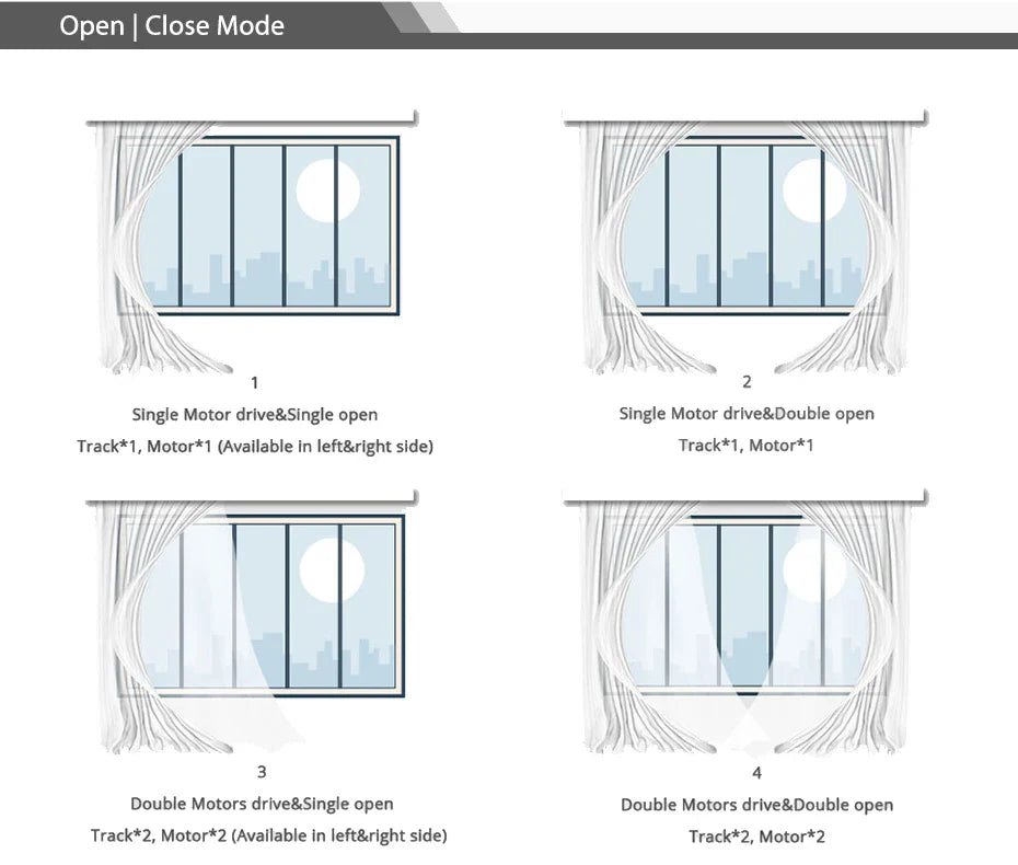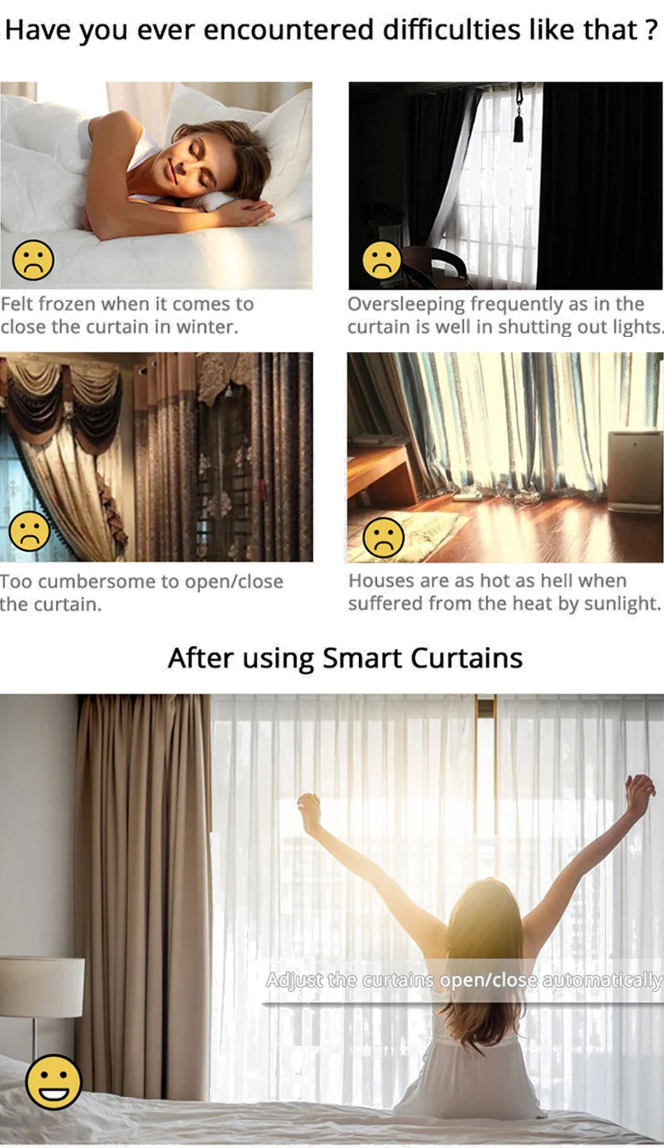 - Automatisk tidsplanlægning: Indstil gardinerne til at åbne og lukke på specifikke tidspunkter.
