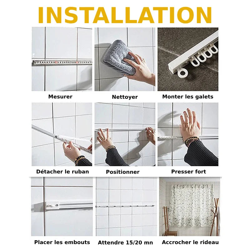 Montering har aldrig været nemmere. Du skal blot rengøre overfladen, fjerne beskyttelsesfilmen fra den selvklæbende bagside og trykke gardinskinnen fast på det ønskede sted. Det er slut med at lede efter boremaskinen, plugs og skruer. Denne selvklæbende gardinskinne uden boring er ideel til glatte overflader som vindueskarme, fliser, glas eller malede vægge. Den er designet til at gøre dit liv lettere og give dig mere tid til at nyde dit smukt indrettede hjem.