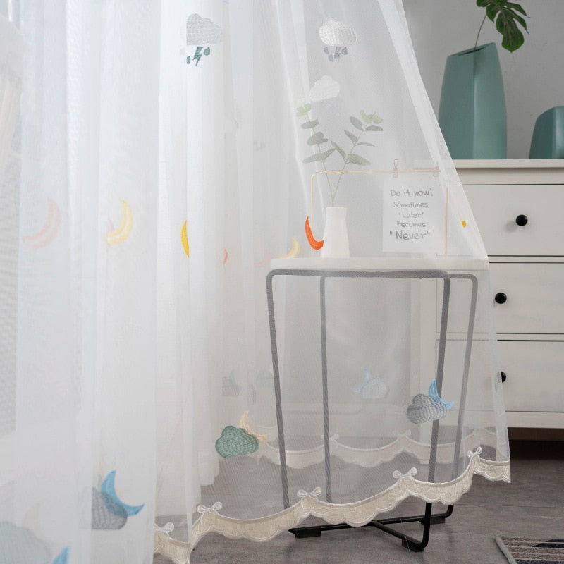 Forvandl dit barns værelse til et eventyrland med vores charmerende gennemsigtige gardin! Dette gardin er ikke bare et vindue til verden, men en invitation til leg og fantasi. Med sine finurlige broderier af skyer, kaktusser og halvmåner i muntre farver, skaber det en let og drømmende atmosfære. Lad sollyset danse blødt gennem stoffet, og oplev, hvordan selv de mindste detaljer i rummet får et løft. Det er det perfekte valg til at tilføje et strejf af personlighed og glæde, samtidig med at det bevarer en lys og åben følelse. Dette gardin er mere end blot en dekoration; det er en del af historien, der venter på at blive fortalt i dit barns værelse.